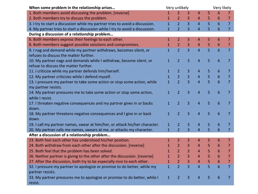 Some of the red highlighted items are reverse scored, but once reversed, they still contribute to the overall concept of communicating constructively. Constructive communication refers to a set of positive behaviors that promote a collaborative problem-solving approach to relationship issues that supports trust and understanding. In contrast, demand/withdraw behaviors are a set of behaviors in which one partner nags and criticizes the other, whereas the other partner avoids and withdraws from the interaction.
